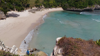 Pantai ini sudah lama ada , namun akses jalan yang kurang bagus membuat pantai ini belum lama dikenal. Akses jalan lebar walu hanya jalan perkerasan batu puth namun cukup untuk sekelas bus kecil masuk. Area parkir luas, ada tanah lapang berumput bisa dijadikan parkir sekaligus arena bermain. Jika mau ke pantai turun lewat tangga batu yang tersusun alami.. mirip sebuah teluk kecil. Ada gua di sebelah pojok barat dapat masuk jika air surut. Pantai pasir putih bersih. Banyak lokasi / spot foto yang bisa ditemui. Baik dari sisi atas batu yang menonjol di sebelah kanan pantai.